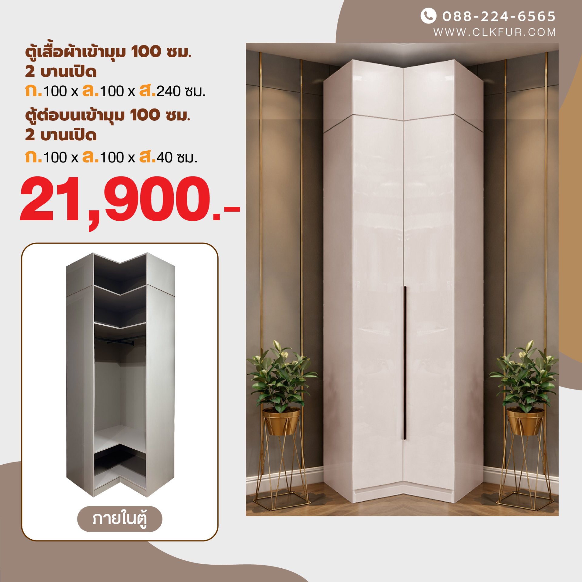 ตู้เสื้อผ้าบานเปิดเข้ามุม พร้อมตู้ต่อบน 100 ซม.
